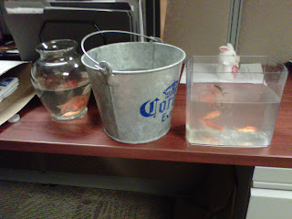 A young woman on my team–a passionate, unapologetic, PETA card carrying animal lover (a woman after my own heart)–asked if she could “rescue” the fish. I gave her the green light and she commenced this very strategic mission which involved a flower vase, a plastic container, and a beer bucket; not to mention a very new team member (it was literally her first week) who was drafted to assist on the expedition. After a few attempts, they managed to collect all of the fish–see picture above. The fish are now living in the lap of luxury in an awesome fish tank w/fish toys and fish food. Happy Ending.